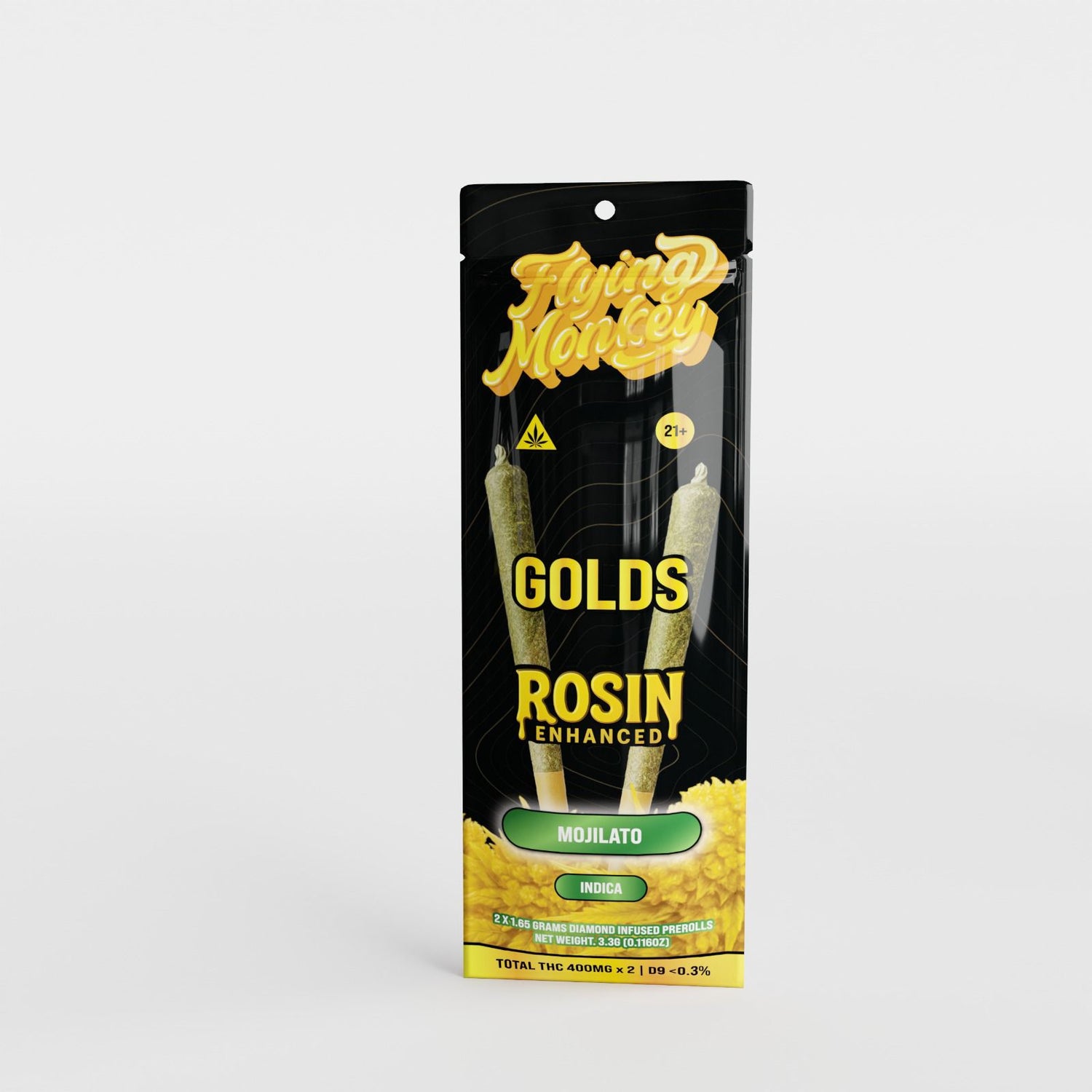 Stock Flying Monkey GOLDS Rosin Enhanced Diamond Infused Prerolls 2 x 1.65g to offer your customers a premium infused preroll option built for smoothness, strength, and standout shelf appeal.