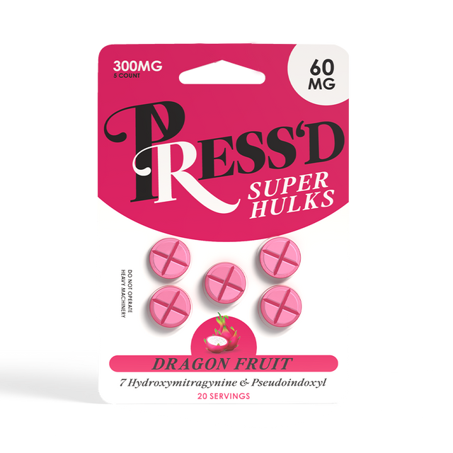 Press’d Super Hulk Tablets combine two powerhouse alkaloids—7-hydroxymitragynine and Red OH (pseudoindoxyl)—in a balanced dual-action formula for enhanced strength, focus, and relief. Each 5-count pack contains 30mg of each alkaloid per tablet (300mg total), offering an elite, full-spectrum experience in a convenient, travel-ready format. With vibrant flavor options and premium formulation, Super Hulk stands as the ultimate evolution in the Press’d lineup.