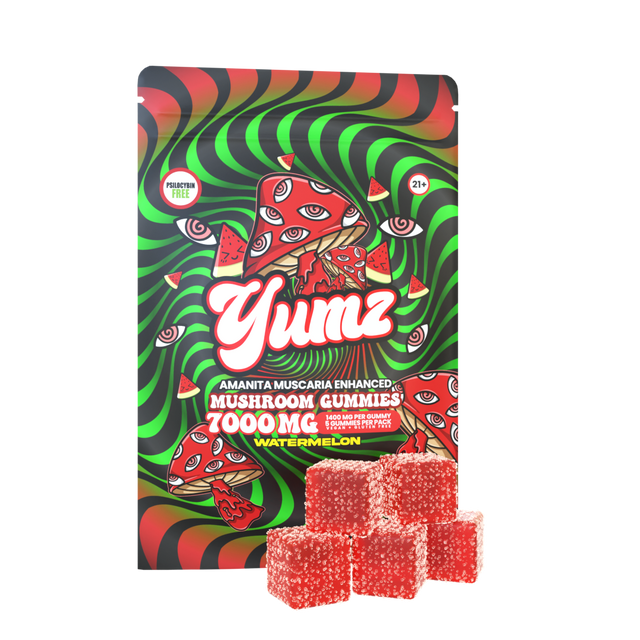 Yumz Amanita Mushroom Gummies combine wild-harvested Amanita Muscaria extract from Lithuania with advanced water-soluble extraction for enhanced bioavailability. Each vegan gummy delivers 1,400mg of high-potency extract (7,000mg per bag), offering a smooth, mildly psychoactive experience distinct from psilocybin. These ibotenic acid-free gummies are crafted for relaxation, creative flow, and natural mood elevation—all wrapped in a delicious watermelon flavor your customers will love.